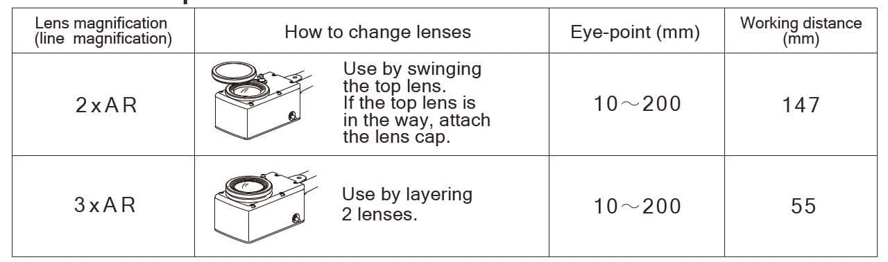 The switchable magnification lenses of 2x/3x are very high quality and illumination source is a bright LED